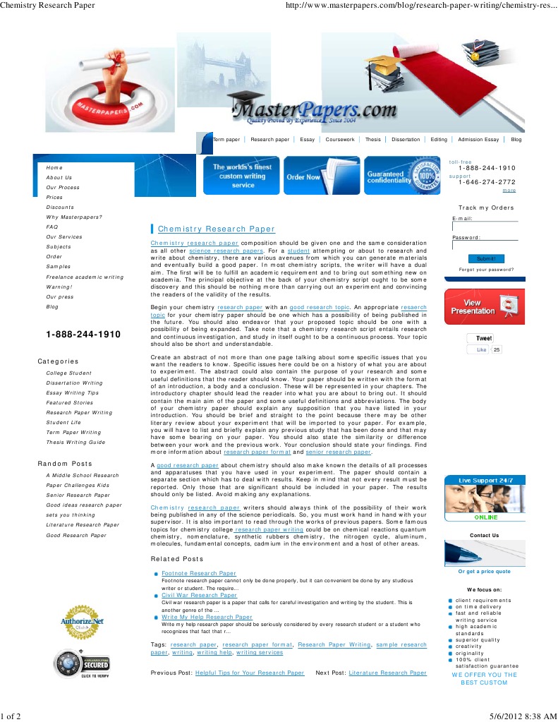 We can meet strict deadlines and we guarantee that you get the flawless quality paper on the chosen date, research paper of chemistry. Choose the type of paper you need written, the number of pages, deadline and other requirements, research paper of chemistry. Select a writer from the list and contact a few of them via our live chat function to help you make your final choice.
